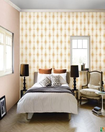 Mẫu giấy với họa tiết ấn tượng làm điểm nhấn thú vị cho không gian phòng ngủ thêm sinh động. Với tông màu vàng nhạt sẽ tăng thêm sự ấm cúng trong căn phòng.