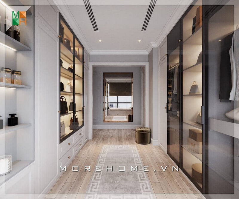 Ấn tượng với không gian hiện đại từ tủ quần áo gỗ acrylic sáng bóng.