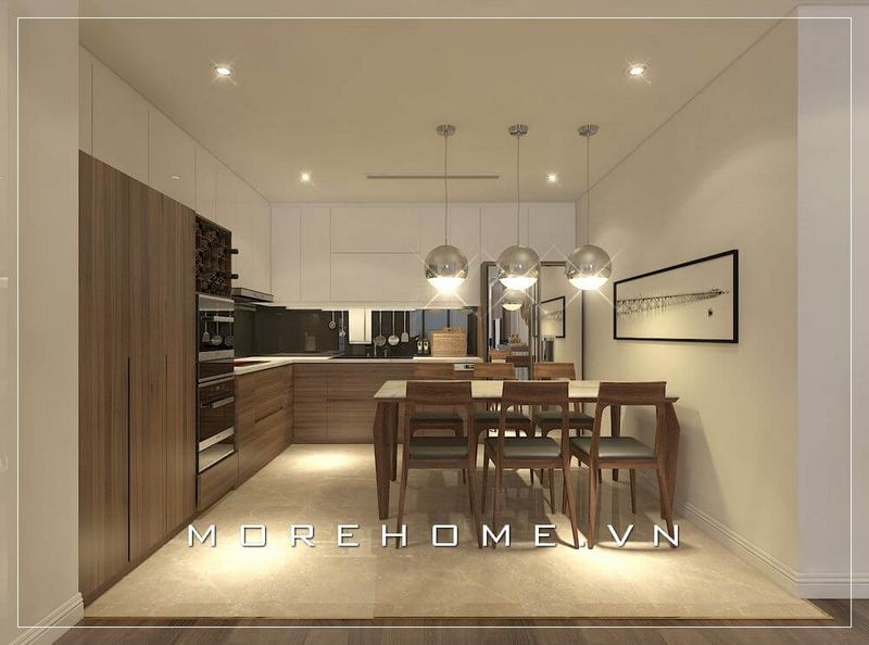 Mẫu tủ bếp gỗ công nghiệp màu trắng - nâu hiện đại hài hòa, nhẹ nhàng với không gian nội thất chung cư ngôi nhà.